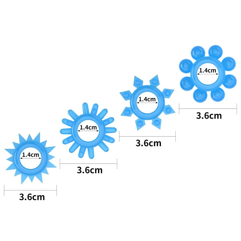 Férfiaknak ajánlott, péniszre helyezhető, 4 darabból álló, sötétben kék színben világító erotikus készlet, mely elősegíti merevedés fenntartását viselője számára. Kialakítása révén behatolás közben a hüvely izom idegvégződéseinek stimulálására is tökéletesen alkalmas. A gyűrűk külső és belső átmérője is azonos. Ajánlott napközben fénynek kitenni a legjobb hatás érdekében.