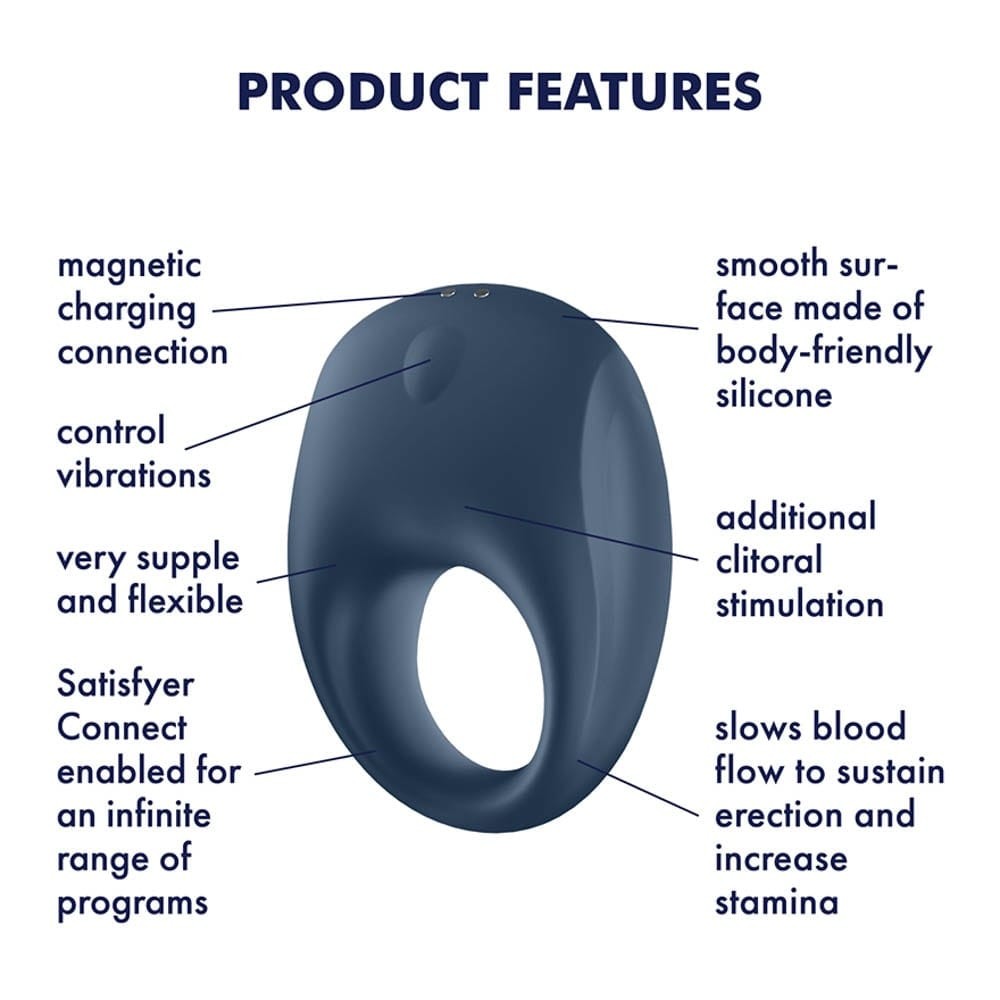A Satisfyer Strong One péniszgyűrű hosszabban tartó merevedést és késleltetett magömlést biztosít a szerelmeskedés során. A selymes, testbarát szilikonból készült gyűrű rugalmasan öleli át a péniszedet. A gyűrű által előidézett hatás intenzívebbé teszi az erekciódat, ami maximális élvezetet garantál. A szerelmi játék során az Strong One Téged és kedvesedet is intenzív rezgésekkel kényeztet. A rezgések az egygombos kezelőfelülettel és az ingyenes Satisfyer Connect alkalmazással is vezérelhetők. Az örömszerző távirányítóján kívül felfedezésre vár még számos egyéb funkció is, mint például a saját rezgésprogramok létrehozása a környezeti zajok vagy a Spotify lejátszási lista alapján.
