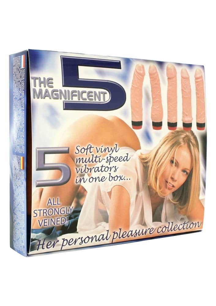 A szett tartalma 5 db 18 cm hosszú, 3,9, 4,3, 4,6, 4,9 cm átmérőjű, erezett felületű, állítható rezgéserősségű vibrátor.