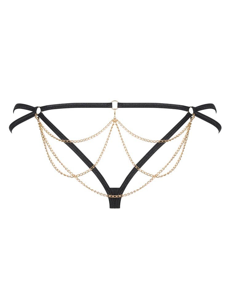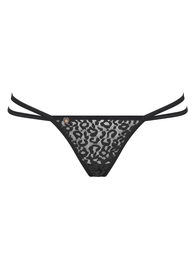 Áttesztő anyagból készített, leopárdmintás, a fenékrészen finom lánccal díszetett tanga. A csomag a melldíszeket nem tartalmazza.